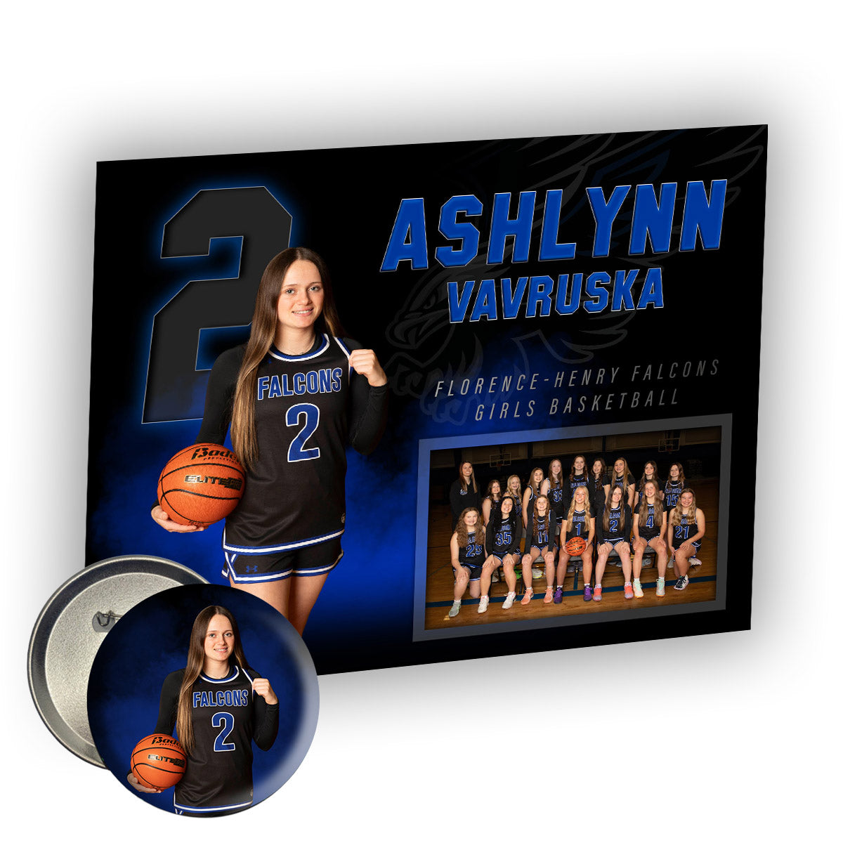 Memory Mate includes a customized 8x10 with the athletes individual and team picture on a colored background with team name, athlete name and year. You have the option to add a button with your Memory Mate. The style and layout of the 8x10 may vary based on sport and year. *** Please be sure to indicate athlete name & jersey number.